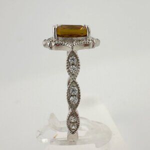 Beautiful lab created sultanite gemstone. Stone known to change color in different light ( from orangish / copper to green). Romantic scalloped band with white gemstones accenting the larger gemstone. Lovely.