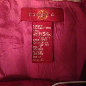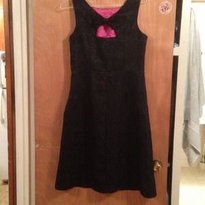 Very nice black dress with floral embellishment design. Small cutout in back with a cute bow above it. 100% polyester. Pink lining on inside. Dry clean only. This was given to me and does not fit I hope someone can use it!