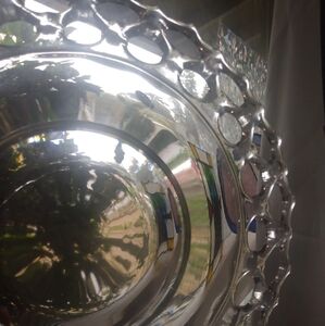 serving plate has an open "crochet" border. it's around 9 inches and would be awesome for serving some Xmas goodies