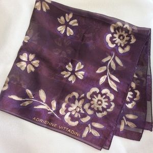Gorgeous Adrienne Vittadini vintage neck scarf. Burgundy color with floral print and shadow striping. Very pretty for Fall ! I believe this is silk, the edges are hand stitched. Measures 21.5"x21". About 33" point to point. Very nice condition. Vintage. Non-smoking home.