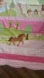 from the Circo collection, featuring various horse designs, a barn, trees, and a pink ribbon detail The quilt has a patchwork design with different scenes of horses in a natural setting, including fields and a barn.