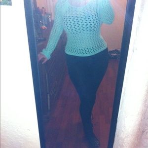 See through, sweater. Looks great with leggings and converse on! Says L but fits like a M