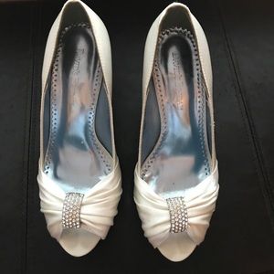 Ivory peep toe with a 3 inch heel. Diamond appliqué! Worn for a wedding and super comfortable! They were the perfect addition to my ensemble!