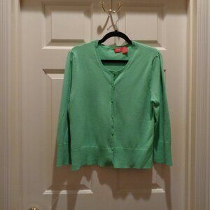 Great color for taking along with your summer outfits for that over-air-conditioned room, or an evening coverup. Goes with so many of your colors. Lightweight button-front cardigan, with a lightly brushed soft inside where it touches your skin. Made of easy care 80% cotton, 18% nylon, and 2% spandex and machine washable. About 23 long and about 19.5" armpit to armpit. The sleeves are about 21" long with some light gathering at the shoulder for ease. About a 4" ribbed cuff at sleeves and hem., and smaller ribbing at neck and placket.