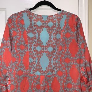 Pretty top, great for work or evening stroll on the beach. Sleeves have silver metal buttons. Color is more muted in person and more of a salmon and robins egg blue colors. Camera didn’t do a great job in capturing correct colors. EUC.
