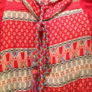 Pink lace blouse with blue and pink Aztec don't down the middle
