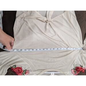Pretty semi sheer cream short sleeve top w/rose applique embellishments size M by I. Joah cottage core coastal cowgirl beachy boho hippie floral Y2K Ed Hardy aesthetic tattoo style sleeves romantic date night festival deo los muertos Day of the Dead aesthetic Valentine's Day beachy