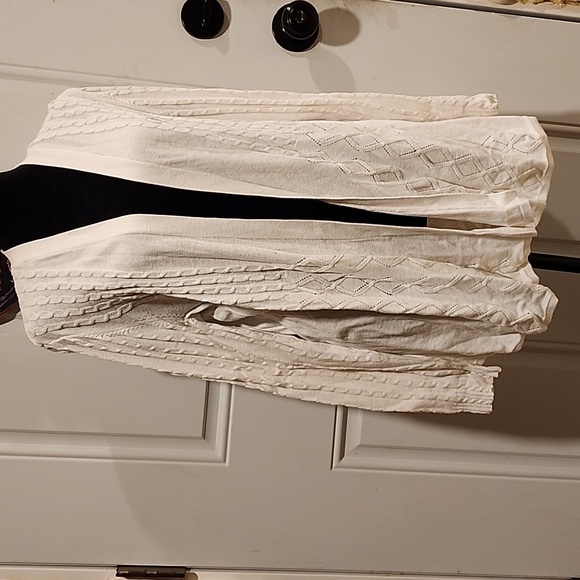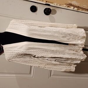 This is a shrug sweater. It doesn't button or zip. It is in great shape. No pilling, no stains, no snags, just a beautiful lightweight Spring time sweater.