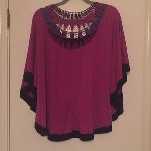 Comfy top 77% Polyester, 20% Rayon and 3% Spandex. Machine wash cold gentle cycle