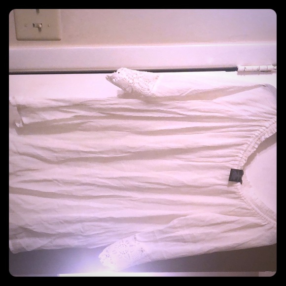 Pretty white top with ruched neckline and intricate lace pattern on sleeves. Shirt is 100% rayon and soft and flowy. Lace sleeves are 100% cotton. NEVER WORN. Tags were removed but I didn’t like how it fit with the pants I got it to match.