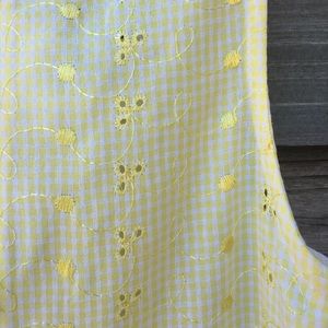 Crisp and pretty! Satin ribbon trim. Self tie back belt. 14 inches underarm to underarm. 30 inches shoulder to hem. Lined bodice front and skirt. Never worn.