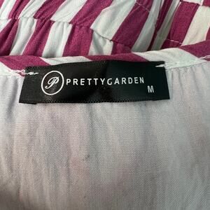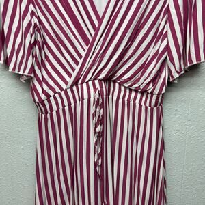 Pretty Garden women's striped dress in pink & white. Cross over v-neck. Elastic waist with tie front detail. Short wide sleeves. Ruffle hem. Lined except sleeves. Midi length. Has a few spots in the lining, please see last picture. In good used condition. No tears or holes.