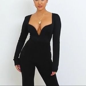 PrettyLittle Thing Petite Black Long Sleeve Plunge Bodysuit, Black, Size 10, NWT