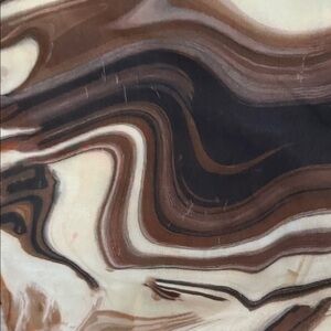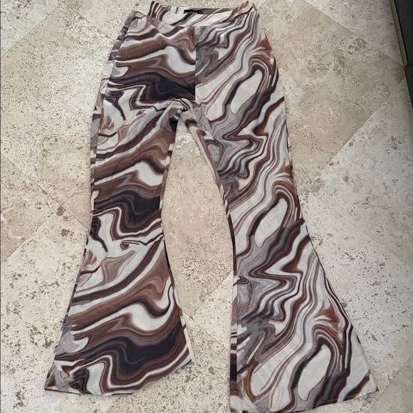 Chic flared pants with an abstract design. Features tones of brown, cream, and black. Slight wear