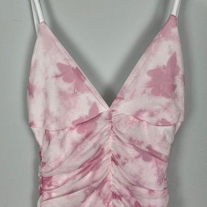 This bodycon dress will get your noticed for all the right reasons. Featuring a baby pink butterfly print with a ruched front and thin shoulder straps