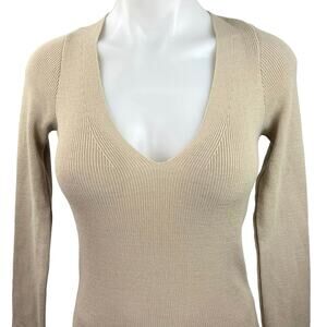 PrettyLittleThing Beige Tan Rib Knit Long Sleeve V-Neck Midi Sweater Bodycon Dress 12