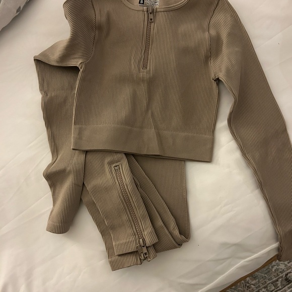 Pretty Little Thing Beige Ribbed Set - Chic beige ribbed top with zipper. Ideal for everyday style. Super cute set.