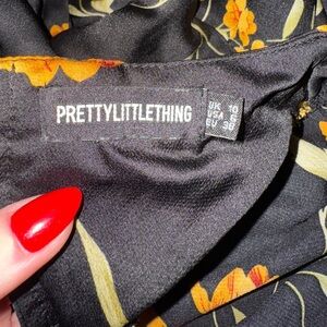 PrettyLittleThing Black Floral Midi Dress Size 6 Puff Sleeve Draped Neck