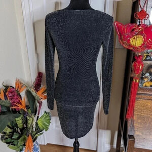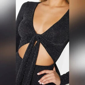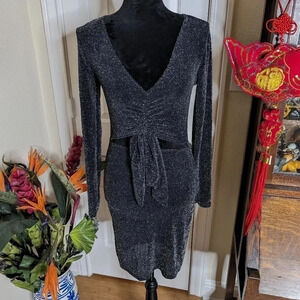 Stunning black mini dress with glitter detail. Features long sleeves and front tie. Perfect for a night out.