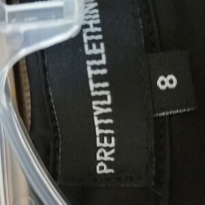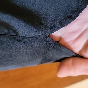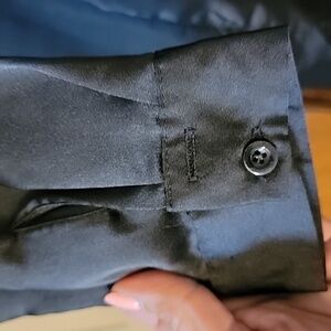 Chic black satin dress. Ideal for a night out.There is no hook to keep the dress from opening in front but if you are good at sewing you could add one
