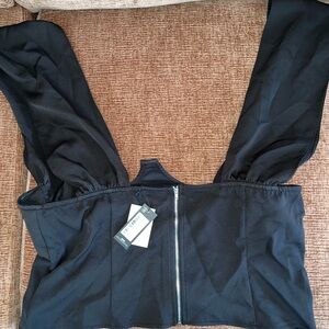 Stylish black top with cross over design. Features a zip detail. Ideal for versatile styling.