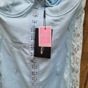 PrettyLittleThing NWT Blue Lace Inset Hook & Eye Bardot Bodycon Dress Womens Size 6