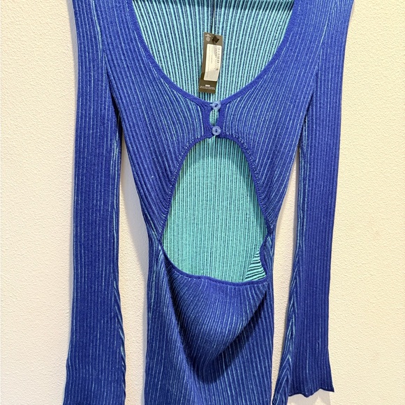 Vibrant blue ribbed bodysuit with stylish cut-out. Long sleeves and button detail. Perfect for a bold look.
