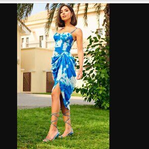 Get noticed for all the right reasons in this dress. Featuring a blue tie-dye satin material with ruched detailing and a midi length. Style this with barely-there heels and simple accessories to complete the look.