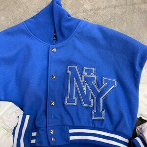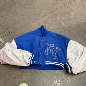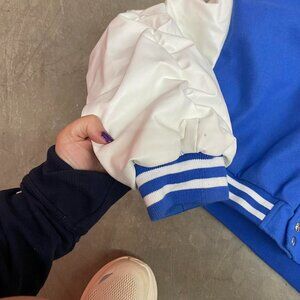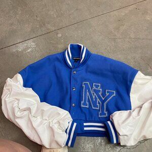PrettyLittleThing Blue and White Oversized Varsity Jacket Large