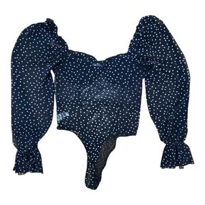 This chic bodysuit from PrettyLittleThing features a striking blue and white color palette with elegant puff sleeves. The fitted design is enhanced by ruffled and bustier style elements, making it a standout piece for any occasion.