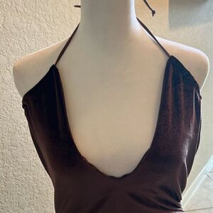Chic brown mini dress. Halter neck design. Perfect for a night out.