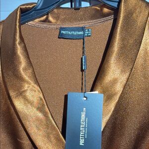 This chic brown blouse from PrettyLittleThing features a stylish wrap design with ruched detailing, offering a flattering silhouette. The long sleeves and lustrous fabric add a touch of elegance, making it perfect for both casual and formal settings.