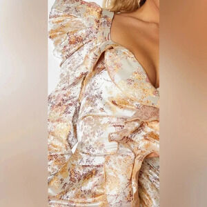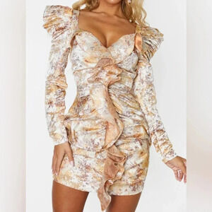 PrettyLittleThing Champagne Jacquard Floral Ruffle Long Sleeve Bodycon Dress
