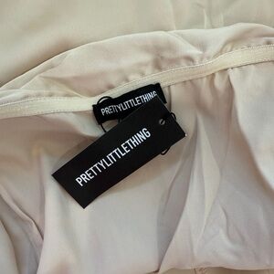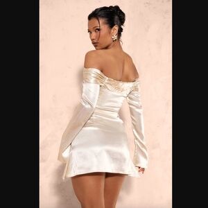 PrettyLittleThing Champagne Satin Pleat Detail Bardot Flared Sleeve Shift Dress