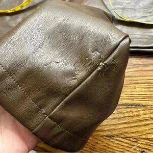 PrettyLittleThing Chocolate PU High Waisted Wide Leg Pants Size 6. Two front pockets, belt loops, zip and button closure. New but has flaws, damage to the waistband where the hanger was holding the pants and there is a crack/blemish at the bottom of one of the pant leg. Both pictured.