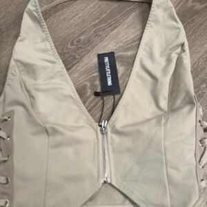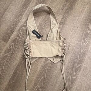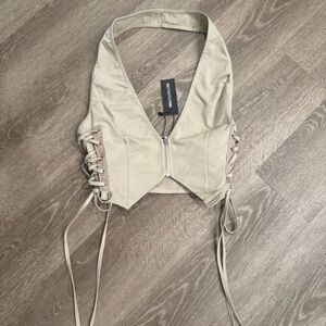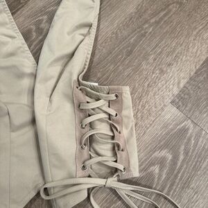 Stylish cream crop top with lace-up sides. Features a front zipper for easy wear. Perfect for a trendy look.