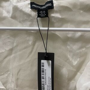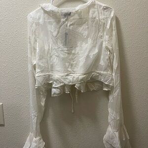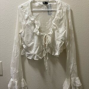 Chic cream blouse with ruffle details. Long sleeves and tie-front. Perfect for stylish outings.