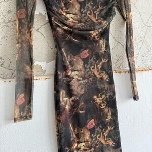 PrettyLittleThing renaissance print mesh mini dress. Long-sleeve bodycon cut with a soft stretch lining. The print’s moody tones and sheer overlay create a dimensional, art-inspired look that flatters every angle. New with tags and ready for your next night out.