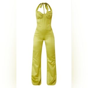 This elegant jumpsuit from PrettyLittleThing showcases a structured corset-style bodice with thin halter straps, offering a sleek and modern silhouette. The wide-leg pants in a vibrant green hue add a touch of sophistication, while the glossy satin-like fabric enhances its luxurious appeal.