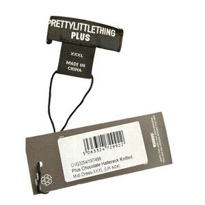 This is a Pretty Little Thing sweater dress in size 22 approximately, UK size XXXL, featuring a halter neck and long sleeves with a shrug detail. The dress is knitted with a solid chocolate brown color, perfect for winter, fall, and spring occasions like travel, weddings, parties, or casual/formal events. Made of 100% polyester, this sexy designer dress is machine washable and adds a touch of elegance and style to any wardrobe.