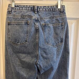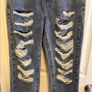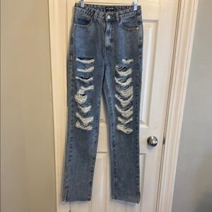 These high rise jeans from PrettyLittleThing feature a striking distressed design with prominent rips and tears on the front, offering a bold and trendy look. The medium wash blue denim and raw hem add to their casual appeal, making them a perfect choice for a relaxed day out.