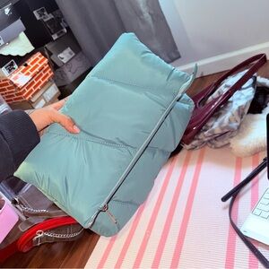 Sleek and modern puffer clutch. Light blue hue adds a fresh touch. Ideal for day or night outings.