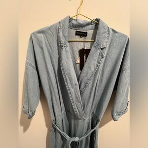 Utility suits are so in! And this light denim one is too good to pass up. Pair with your favorite sweater for the fall/winter! Includes side zipper.
