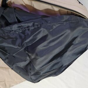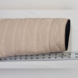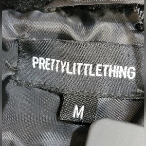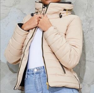 New With Tags PrettyLittleThing Mara Stone Puffer Jacket Women's Size Medium. High collar, front zipper closure, gold tone accents, hood folds into collar with zipper closure, pockets, faux fur collar.
