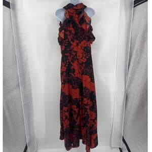 Large floral print in orange red tone, flutter ruffles on skirt wrap like edges and neck and arms