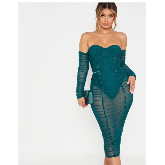 Jasper Green Mesh Ruched Velvet Binded Bardot Midi Dress, never worn, fits like SZ 6, hunter or dark green color, beautiful dress just didn’t fit me well.. On the hanger does no justice