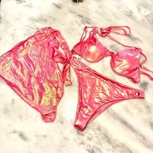 PrettyLittleThing Metallic 3-Piece Underwired Cover Up Pink Bikini Set Size 12