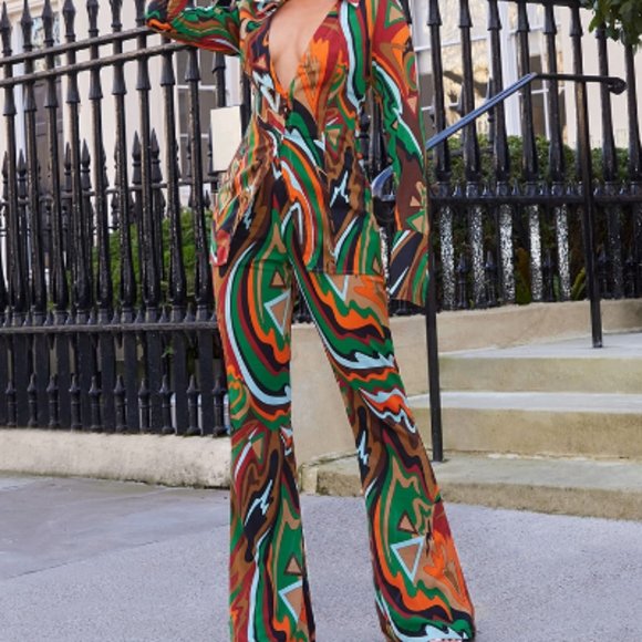 Vibrant abstract pattern. Boot cut design. Eye-catching style. This matching set is everything! I wore this once for 70s party. This set is in excellent used condition. Please ask any questions before purchasing. Thank you 😊