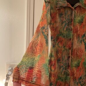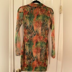 Chic dress with a vibrant multicolor pattern. Features a stylish design for a standout look.