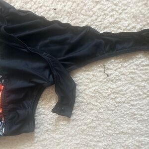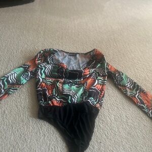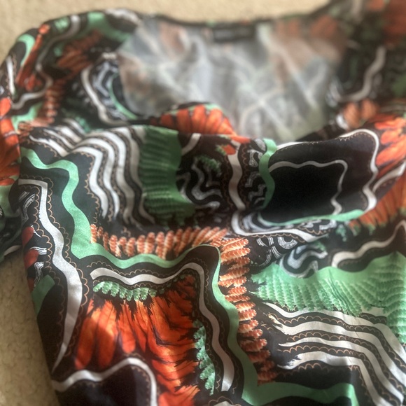 Chic top with a dynamic multicolor design. Features bold orange, green, and black hues.